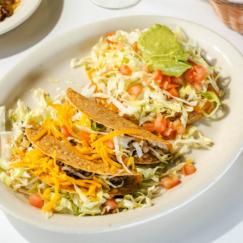 Three crispy beef or chicken tacos topped with lettuce, diced tomatoes and cheese.