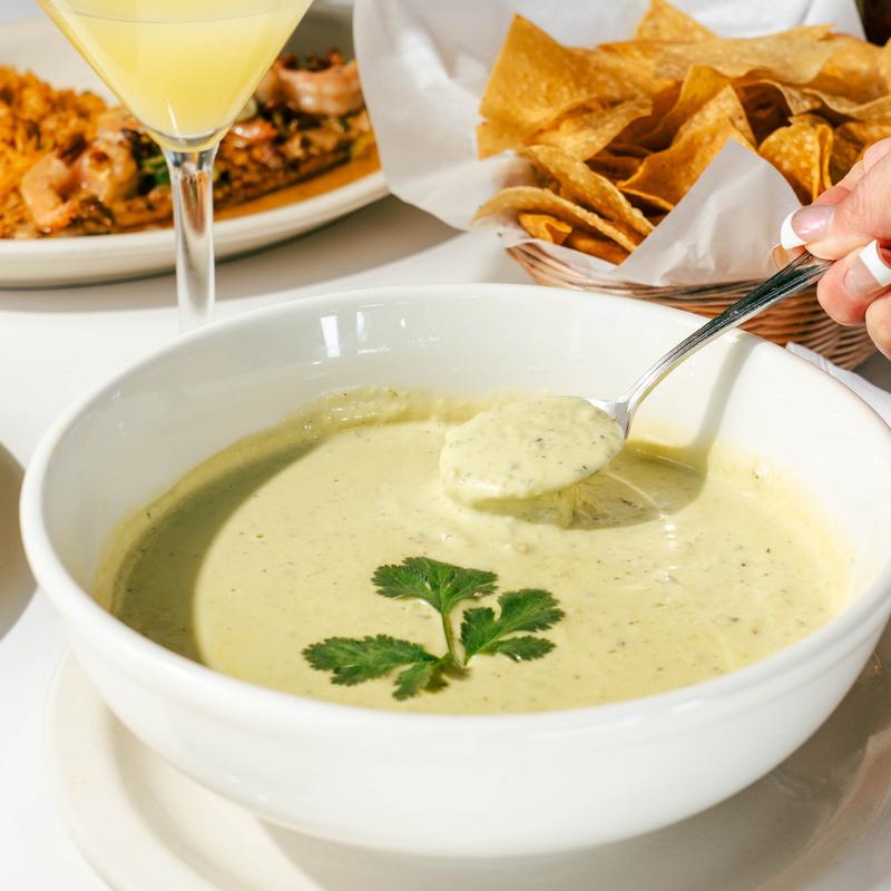 Two chicken or beef enchiladas topped with creamy poblano sauce and white cheese.