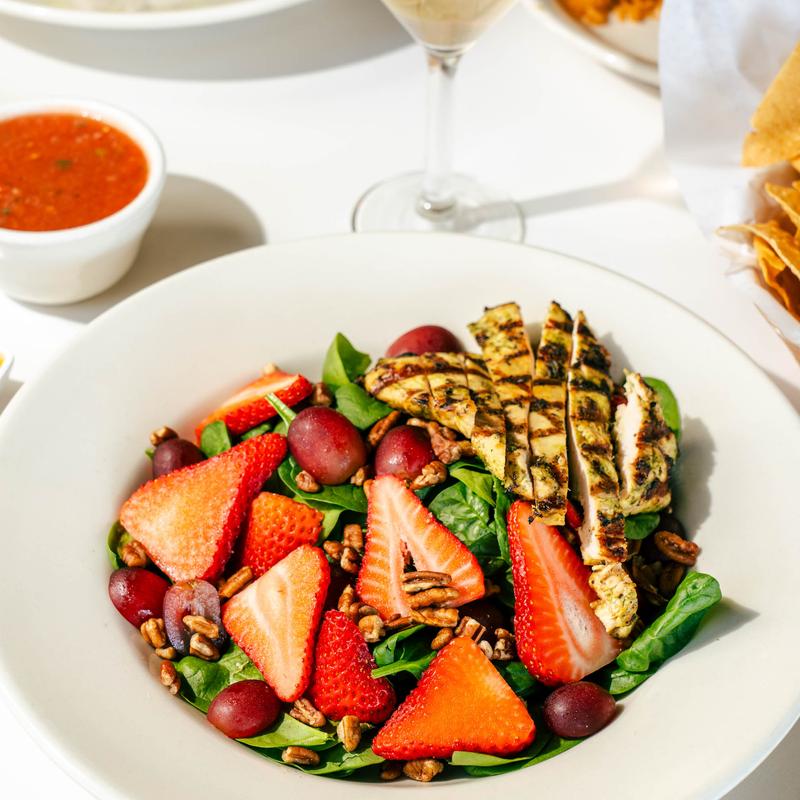 Spinach tossed with red grapes, strawberries, pecans with grilled chicken or shrimp in citrus dressing.