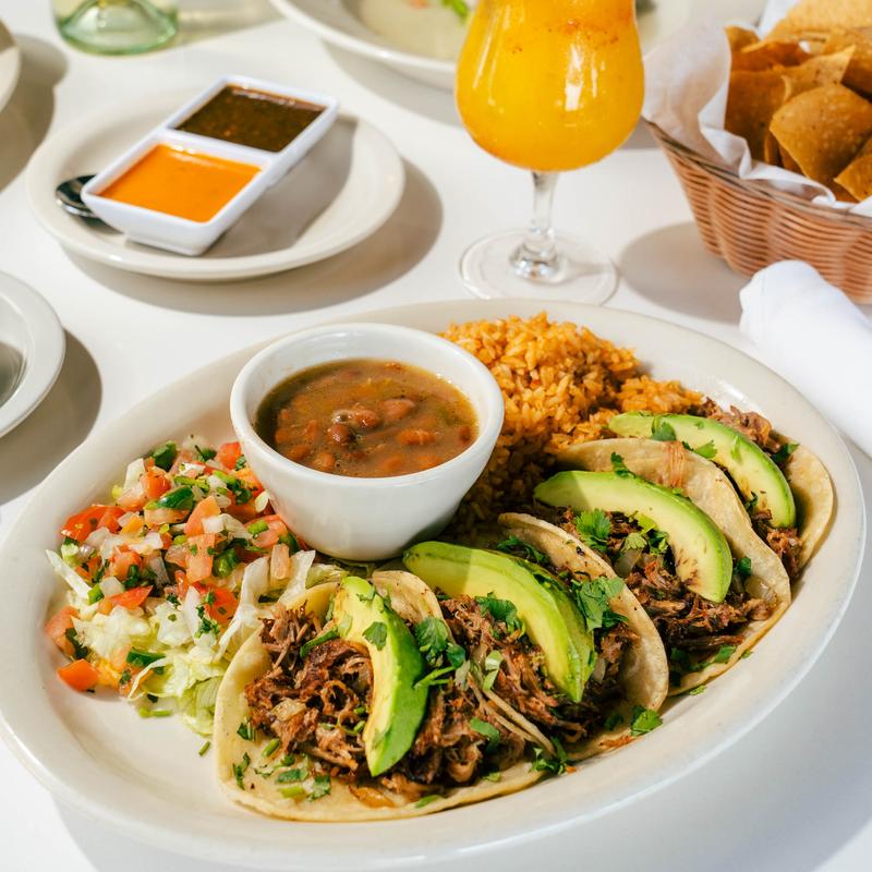 Four tortillas filled with pork carnitas, onions, cilantro, sliced avocado and pico de gallo.