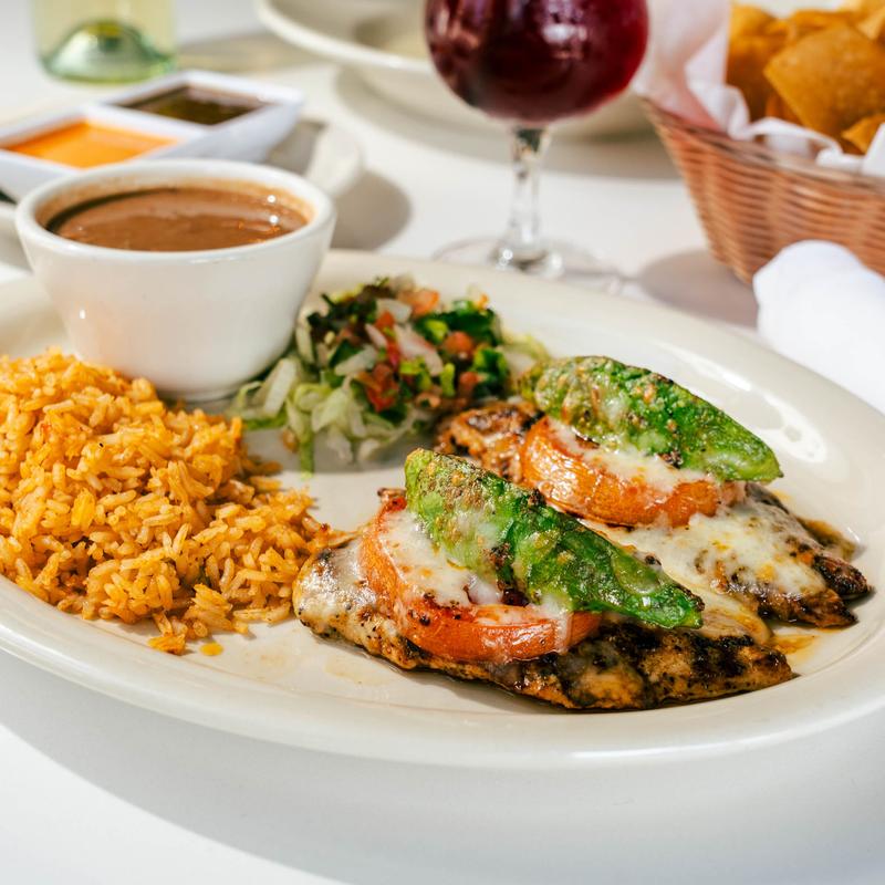 Grilled marinated chicken breast topped with creamy chipotle or creamy poblano sauce and monterey jack cheese.